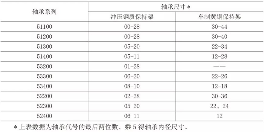 推力球軸承所用保持架為鋼制沖壓保持架和車制銅保持架兩種。具體規(guī)格所用保持架材料參見下表: